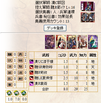 UC淳于瓊(暗殺の陰謀)・SR卑弥呼(天照の神光)・R荀攸(地勢の透察)・LE夏侯惇(あしたのために)・R袁術(血の渇望)・GC郭図・GR荀彧
