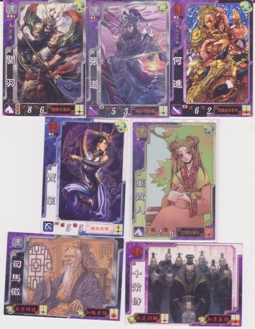 R関羽(復興の温杯)・R張バク(決起の不動車輪)・UC何進(何進の大号令)・C賈華(槍兵召喚)・SR董貴人(亡国の舞)・GR司馬徽・GC十常侍