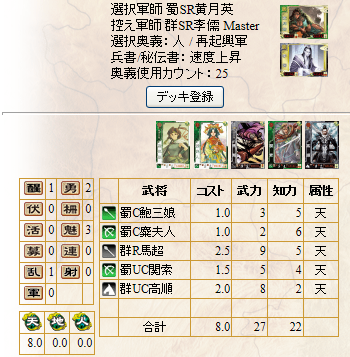 C鮑三娘(大車輪戦法)・C麋夫人(野戦の舞い)・R馬超(錦馬超の閃光)・UC関索(天意の導き)・UC高順(卑屈な急襲)